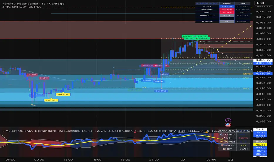 Signals & markers: Buy/Sell labels, divergence markers, and midline retest markers (optional).
