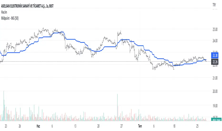 Midpoint - MG indikatörü Netdania uygulamasında bulunan bir göstergedir. Bende Tradingview kullanıcıları için bu ortama taşıyarak katkıda bulunmak istedim. Temel mantığı belirlenen periyotlarda en yüksek ve en düşük seviyenin toplanarak ikiye bölünmesiyle ortaya çıkan değerdir. Belirlenen aralık kullanıcı tercihine bırakılmıştır. İndikatör ayarlarından istenen aralık seçilebilmektedir. Fiyatın bu ortalama ile aşağı veya yukarı kesişmesi bize ticaretimiz ile alakalı yardımcı unsur olarak kullanılabilmektedir. Faydalı olması umuduyla teşekkkürler.