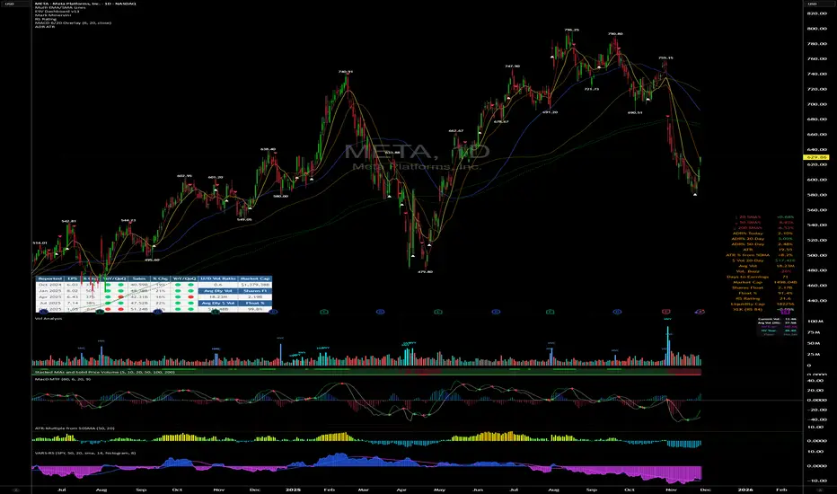 ADR / ATR / Other Info Table is a comprehensive, fully customizable information dashboard that displays essential stock metrics in a clean, organized table overlay. At a glance, monitor your position relative to key moving averages (20, 50, 200 SMA) with dynamic trend arrows showing whether each SMA is rising or falling, plus distance from 52-week highs and lows. Track volatility with today's ADR%, 20-day and 50-day ADR% averages, ATR values, and ATR deviation from its 50-day mean—all with optional color-coded thresholds to quickly identify elevated volatility conditions. The volume section provides deep insights including 20-day and 5-day average dollar volume, projected volume, relative volume, relative dollar volume, and Volume Buzz (percentage deviation from average). Fundamental data such as market cap, shares float, float percentage, days until earnings, RS Rating (relative strength vs. S&P 500), liquidity cap, sector, sector ETF performance, and industry group round out the display. Every metric can be individually toggled on or off, and the table offers extensive customization including position, size, text alignment, background color, and multi-tier color thresholds for ADR%, Volume Buzz, and Relative Dollar Volume. Perfect for swing traders, momentum traders, and anyone who wants critical market data consolidated into one efficient, non-intrusive display.