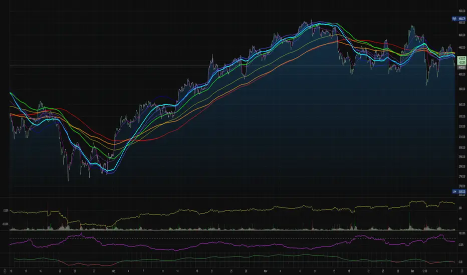 • A master time resolution ("Timeframe") is also user-definable. And unlike most other moving average charts, this won't affect the internal "length" variable (specified days are still respected), it only changes the graphing resolution. You can also specify to use chart's resolution - which, as you know, is not very useful for moving averages - yet so many moving average scripts on Trading View don't let you specify otherwise.