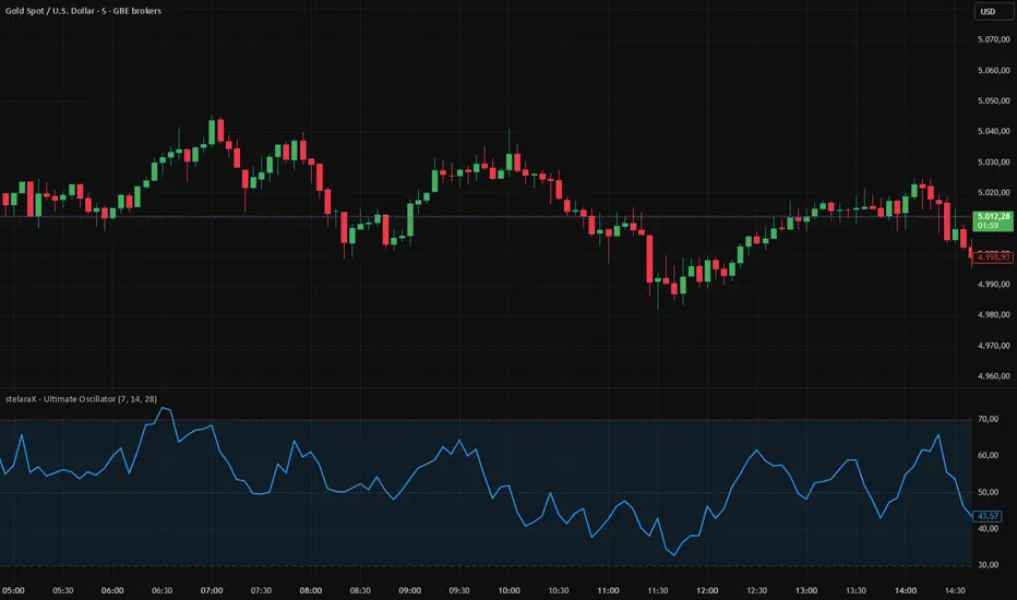 stelaraX – Ultimate Oscillator is a momentum oscillator designed to capture price momentum across multiple time horizons. By combining short-, medium-, and long-term buying pressure into a single value, it reduces false signals often seen in single-period oscillators.