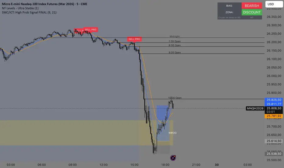 SMC/ICT: High-Probability Trend Signal This professional-grade indicator combines ICT/SMC concepts with Moving Average momentum. It identifies the Daily Bias using Candle Range Theory and tracks the Midnight Open to define Premium and Discount zones. To minimize noise, it only triggers EMA 9/21 crossover signals when they align with the higher-timeframe trend and institutional pricing levels. It also features a dynamic New Week Opening Gap (NWOG) anchor for structural reference.