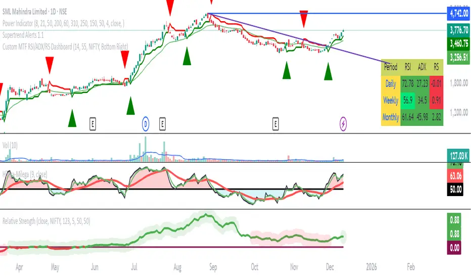 The table give at one glance the RSI,ADX and Relative Strength values on the 15 min,125 min, Daily,Weekly and Monthly timeframes to help identify the stocks with strong momentum securities. The Table is movable at various parts of the screen from a drop down menu and the values of RSI,ADX and RS period can also be changes.Enjoy!