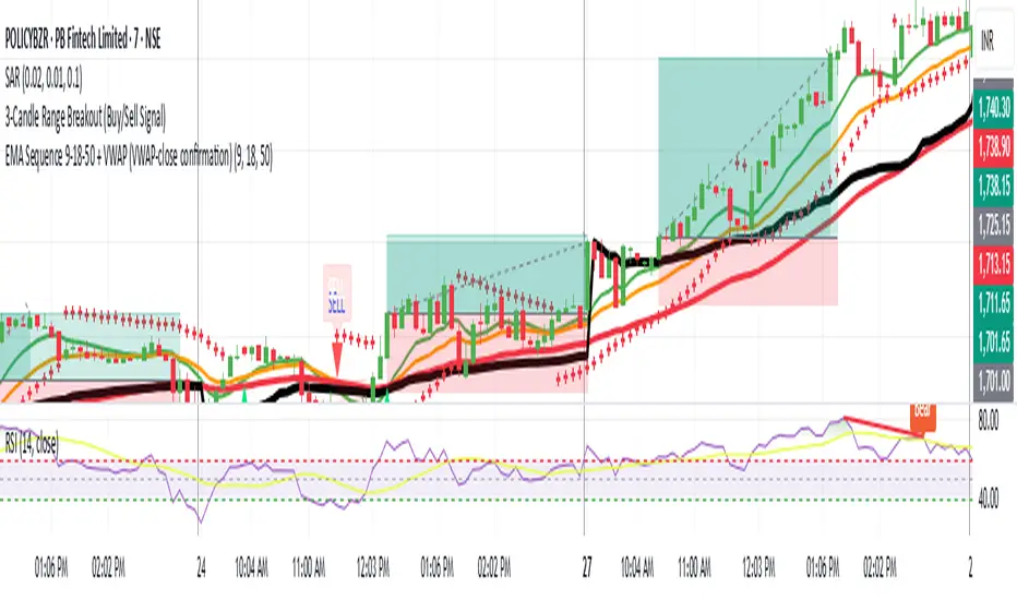 This script identifies a 3-candle range breakout pattern. It looks for two consecutive inside candles following a base candle and triggers a buy or sell signal when price breaks the base candle’s high or low, confirming bullish or bearish momentum.