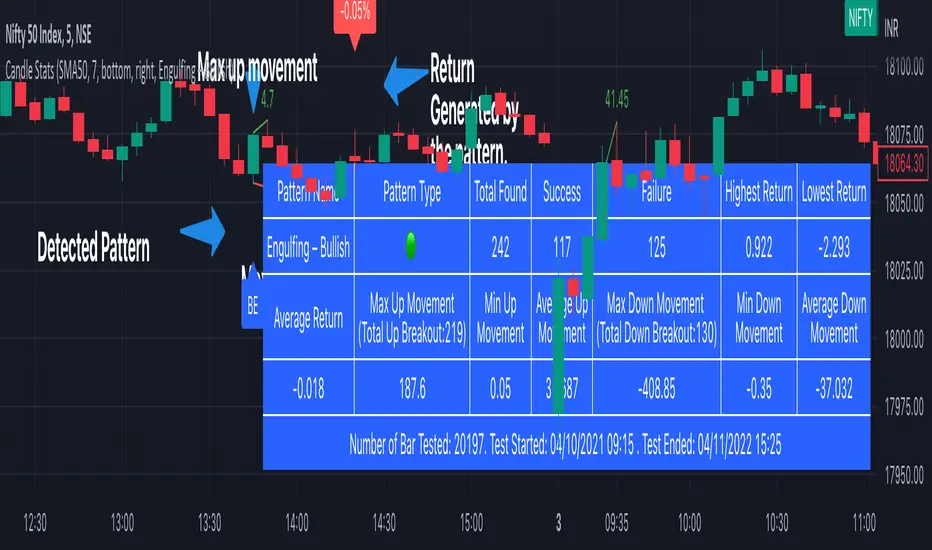 Highest Return: Highest return generated by the pattern (assuming trade taken at the open of the next candle and closed at the close price of the last candle of the holding period).