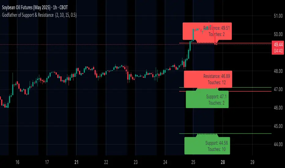 The Godfather of Support & Resistance script is a powerful tool designed to help traders identify critical support and resistance levels on their charts. These price levels are vital for understanding market behavior, as they often act as turning points where prices reverse, consolidate, or break through. By automating the detection of these levels, this script simplifies your trading decisions and enhances your technical analysis.