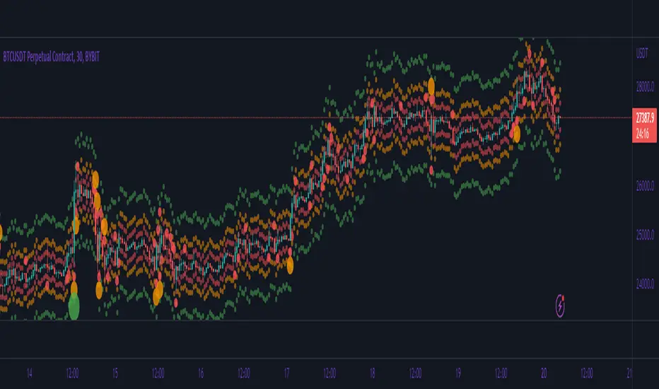 This plots liquidation alerts for different levels of leverage. The script calculates the liquidation prices for both long and short positions based on the inputted leverage values. Then, it plots dots on the chart where liquidation can occur for each level of leverage. Additionally, it plots circles on the chart only when a liquidation event occurs, at which point the circle changes color to indicate the level of leverage that triggered the liquidation.