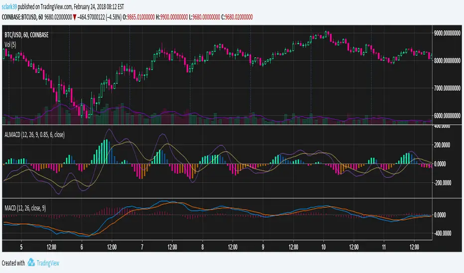 MACD built out of two Arnaud Legoux Moving Average lines of different periods. The signal line is still an EMA of the MACD line, just like with the normal MACD.