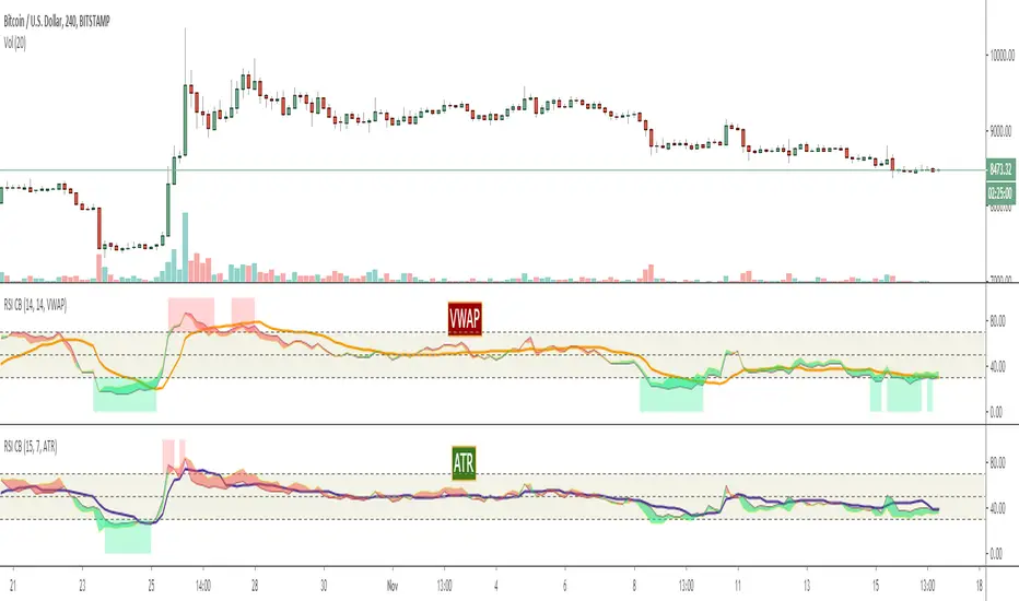 In this study RSI is weighted with ether VWAP (volume-weighted average price) or ATR (Average True Range). The user can select that through the menu. RSI can have a reading from 0 to 100. The values of 70 or above indicate that an instrument is becoming overbought or overvalued and may be primed for a trend reversal or corrective pullback in price. The values of 30 or below indicates an oversold or undervalued condition.