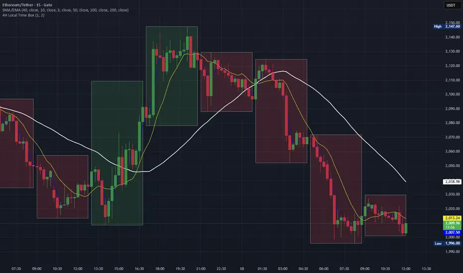 This indicator visualizes 4-hour (4H) time ranges as boxes based on the user’s local time.