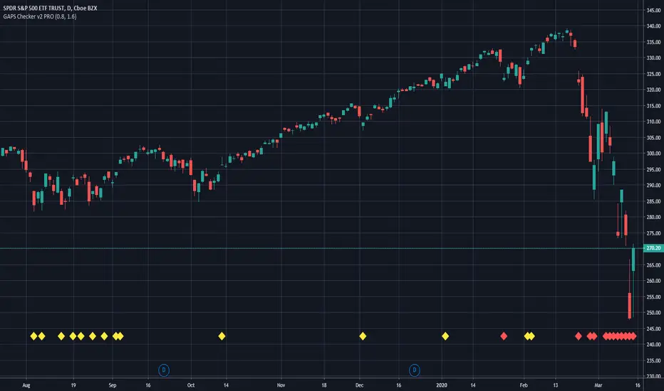 It uses two different sorts for large GAPS (yellow, e.g. larger than 2%) and for very large GAPS (red, e.g. larger than 4%). These values can be changed in the indicator settings.