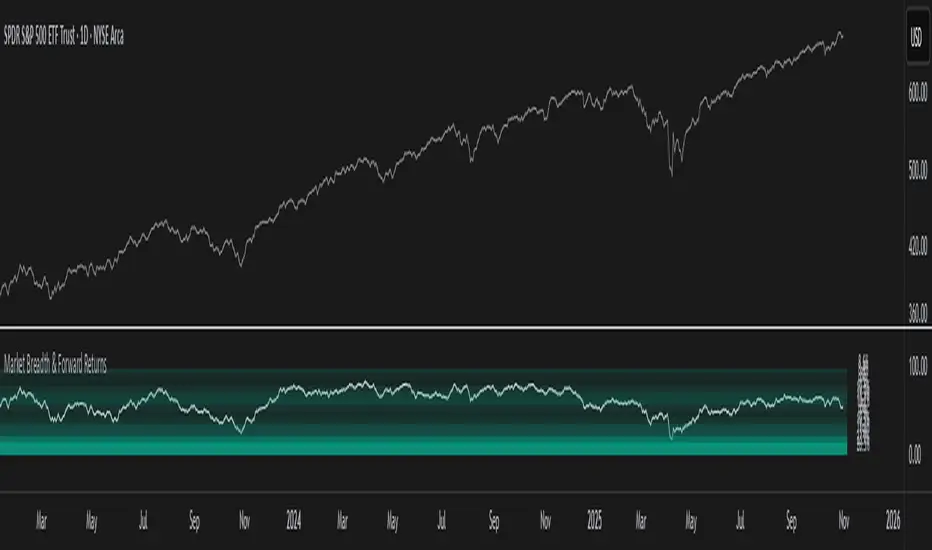 This indicator shows how future index performance has historically behaved after different levels of market breadth. The heatmap reveals which breadth zones have tended to precede better or worse forward returns. This is strictly a statistical conditional-expectation map, not a set of signals.