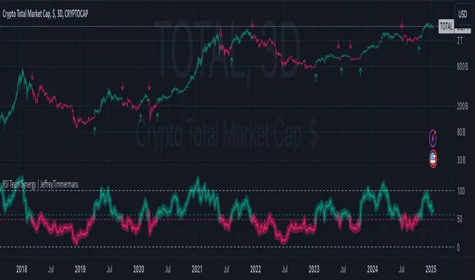 The "RSI Team Synergy" indicator is an advanced and highly customizable tool that integrates a Double RSI (DRSI) approach for comprehensive trend and momentum analysis. It utilizes two layers of RSI calculations, along with optional smoothing and various moving average types, to enhance signal accuracy. The dynamic visuals and alerts make this indicator a valuable resource for traders aiming to optimize their strategies.