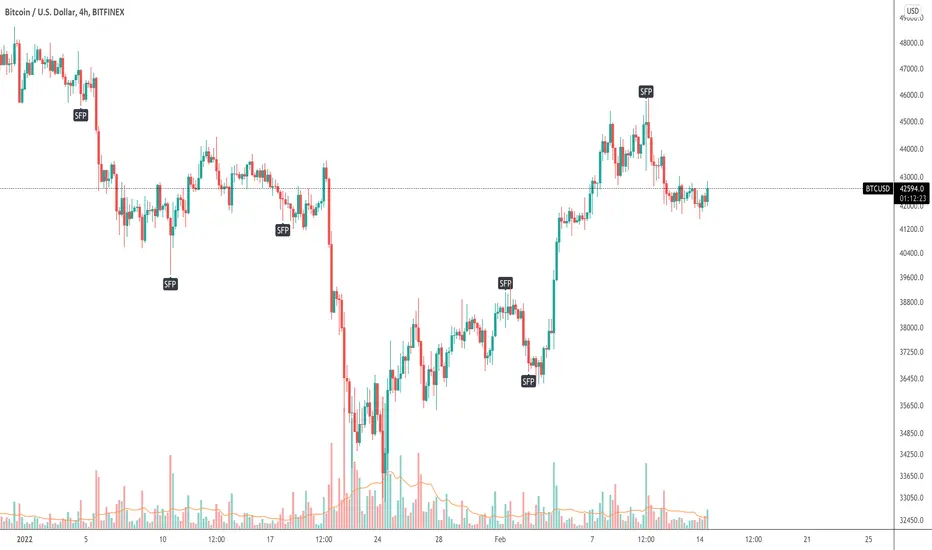 A SFP occurs when the current candle takes out a previous swing high but closes below it (or takes out a previous swing low but closes above it). We usually look for a reversal after a SFP.