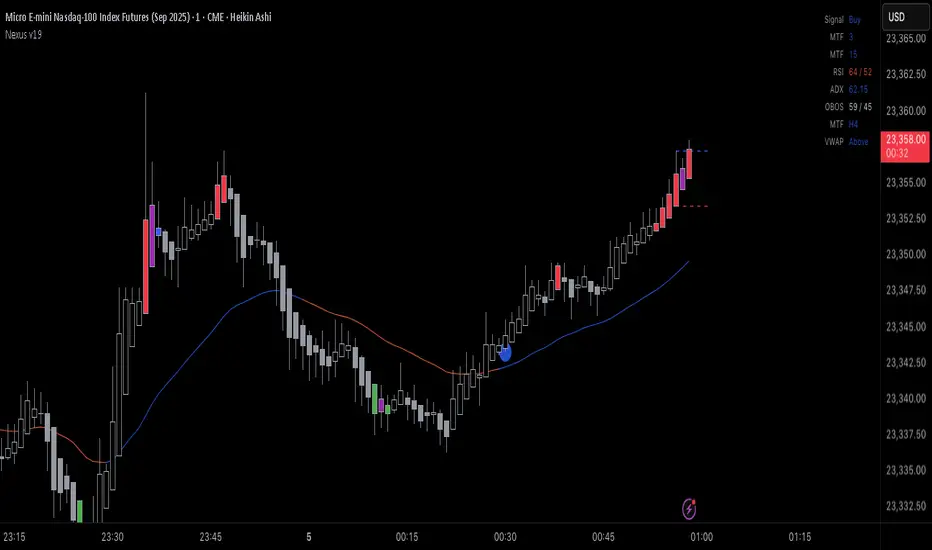 The Nexus v10 is a sleek, modern, and versatile trading indicator that delivers precise buy and sell signals by synthesizing a confluence of technical factors, including Heikin Ashi candles, RSI, ADX, and EMA crossovers. The name "Nexus" captures its core strength—connecting and synthesizing multiple signals into a cohesive trading decision point. The term evokes a central hub or convergence, reflecting the script’s confluence-based approach, dynamic adaptability, and real-time precision for scalping. Designed for traders seeking clarity and efficiency, it’s a powerful tool for navigating dynamic markets.