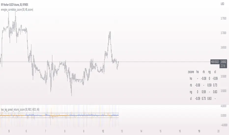 A table to help track correlations between the four major energies contracts of the CME. The table shows the z-score of the current correlation value between HO, RB, CL, and NG. The inputs are: