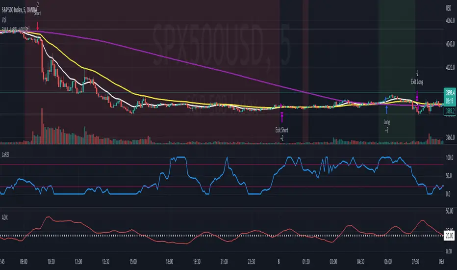 This strategy uses Moving Average Ribbon, Laguerre RSI, and ADX. This script only displays the MA ribbon, you will need to add Laguerre RSI and ADX separately.