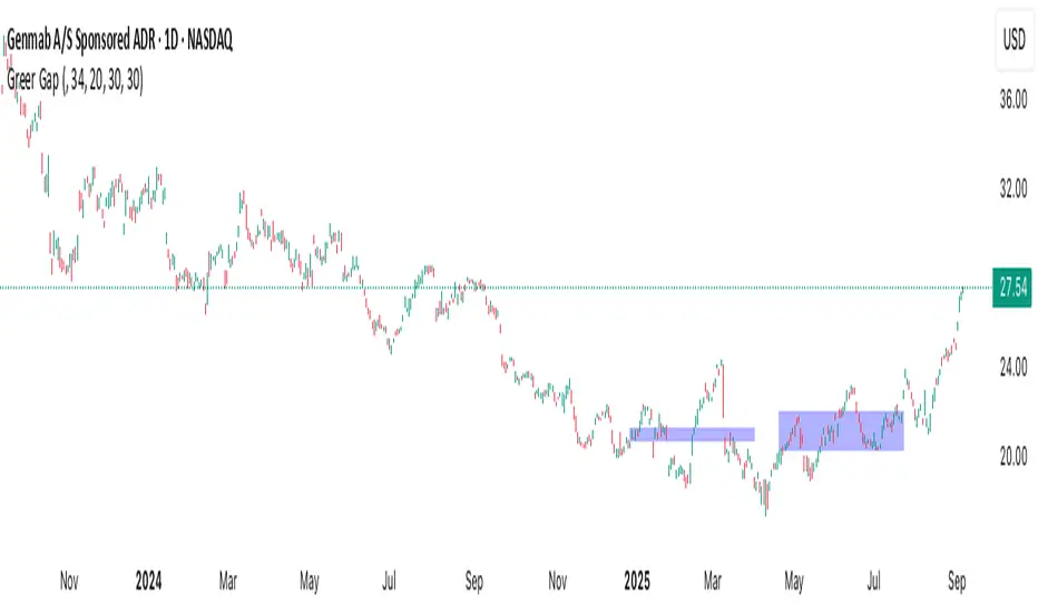 This indicator detects and displays **Fair Value Gaps (FVGs)** on the chart, with a focus on specialized **Greer Gaps**: