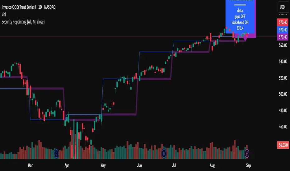 I set the defaults for viewing monthly security functions on the daily timeframe. Only the first 2 security functions plot with the default settings, so change the settings as needed. Be sure to read the original notes and detailed explanations in the PineCoders posting "How to avoid repainting when using security() - PineCoders FAQ."