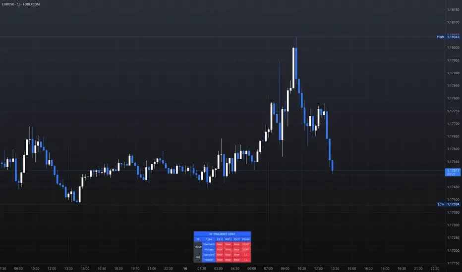 Traders can use both types of SSMT divergences to anticipate potential reversals in points of interest such as higher timeframe swing points, supply/demand zones, higher timeframe imbalances, key levels, etc. This indicator can also be beneficial in identifying cracks in correlation via Hidden SSMT when there are no divergences off the highs and lows. Divergences can come in different forms relating to Intermarket SSMT. For example, if one market triad is all making lower lows while the other market triad is making higher highs, this can be deemed a divergence between the two markets. Another example would be one market triad all makes lower lows while another market triad makes a bullish SSMT. This can potentially signal a bullish move up. SSMT divergences (standard and hidden) can be used as a confirmation tool with other confluences to identify trend direction with respect to points of interest, higher timeframe order-flow, lower timeframe order-flow, etc. In addition, having both a Standard SSMT and Hidden SSMT divergence display could potentially signal a reversal. It is up to the trader to gauge the price action at the time.