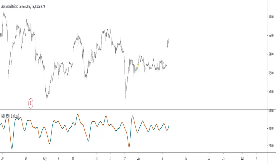 In technical analysis most bandpass filters like the MACD, TRIX, AO, or COG will have a non-symmetrical frequency response, in fact, this one is generally right-skewed. As such these oscillators will not fully remove lower and higher frequency components from the input signal, the following indicator is a bandpass filter with a more symmetrical frequency response with the possibility to have a narrow bandwidth, this allows the indicator to potentially isolate sinusoids from the input signal.