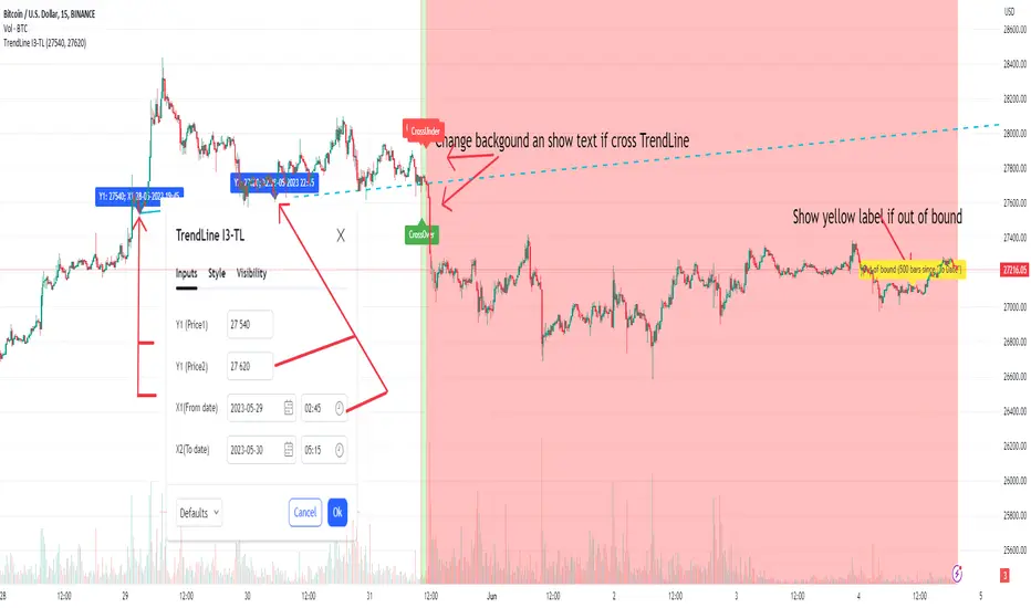 -Determine when the price is crossOver or crossUnder the trend line, display that time on the chart and send an alert.
