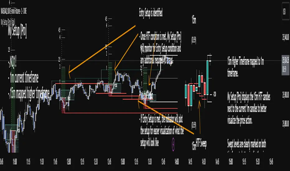 My Setup [Pro] operates by continuously monitoring price action across two synchronized timeframes—your chart's timeframe (LTF) and a user-defined Higher Timeframe (HTF)—to identify precise trading opportunities.