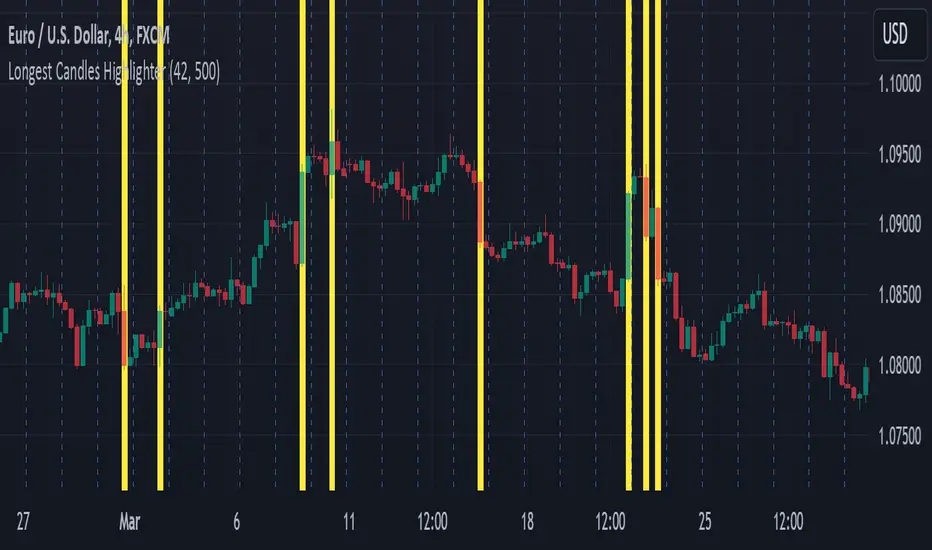 The Longest Candles Highlighter is a simple yet effective tool that identifies and highlights candles with significant price ranges. By visually marking candles that meet specific size criteria, this indicator helps traders quickly spot high-volatility moments or significant market moves on the chart.