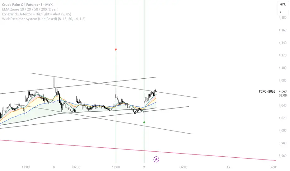 Wick set at 9 ticks..the longer the better..cut loss at lower of the wick..wait for candle completion in TF 5