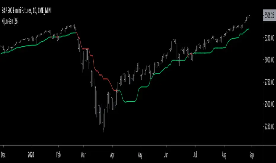 The Kijun-Sen line, otherwise known as Baseline is simply the middle price between the highest high & the lowest low over a given period of time.