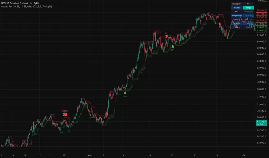 Absorption Reversal detects institutional absorption patterns at the extremes of a trading range. When price reaches a range boundary, large limit orders from institutional players can "absorb" aggressive market orders — this creates a characteristic candle with high volume and a long rejection wick. The indicator identifies these setups and waits for confirmation before signaling a reversal.