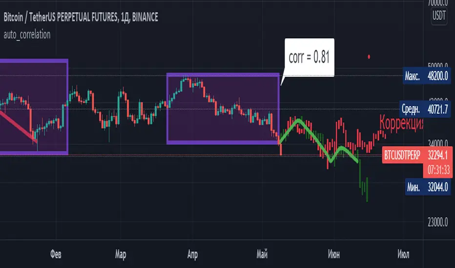 This indicator shows the Pearson correlation coefficient between different periods of one financial instrument. Two dates are set, which are the starting points of two series, between which the correlation coefficient is calculated. The correlation period is taken from the difference of the current date from the second reference point. The indicator is designed to analyze the correlation only on the 1D timeframe.