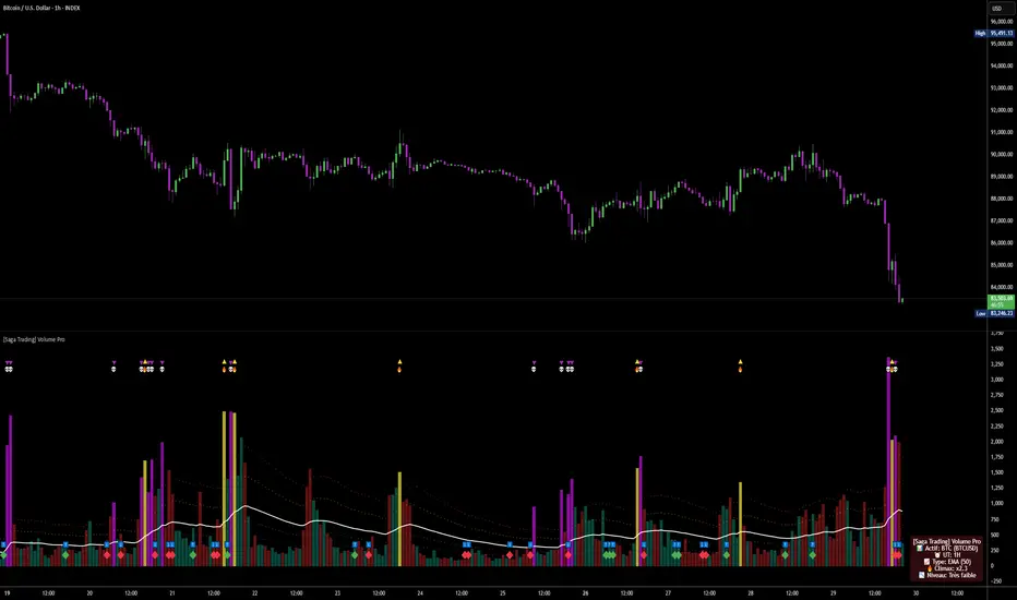 Rather than relying on fixed thresholds, the script evaluates traded volume relative to its own recent behavior in order to highlight periods of excess participation. These situations may occur during panic selling, capitulation, or late-stage momentum, when risk tends to increase for late entries.