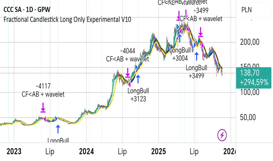 This document provides a professional English description of the "Fractional Candlestick Long Only Experimental V6" strategy using pure CF/AB fractional kernels and wavelet-based filtering.