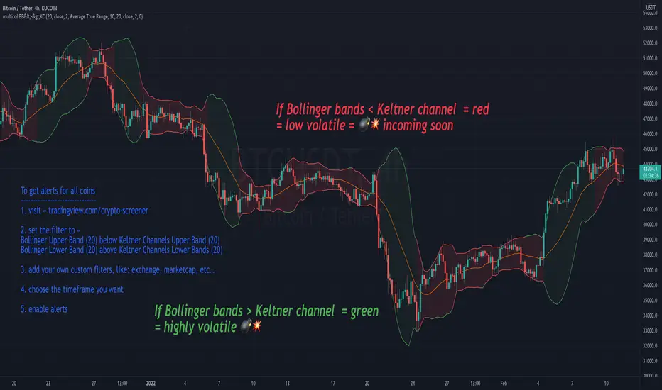 If the Bollinger bands are smaller then the Keltner channel (colored red), the price action is low in volatility… meaning a breakout (colored green) will happen soon.