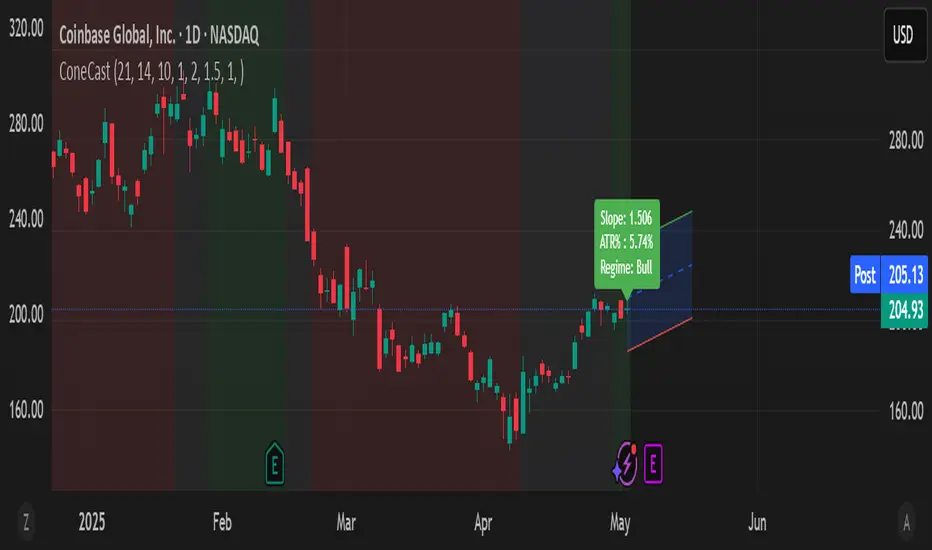 ConeCast doesn’t follow price — it predicts a possible future price envelope using trend + volatility math, without relying on lagging indicators or repainting logic. It's a hybrid of regression-based forecasting and dynamic risk zoning, designed for swing traders, scalpers, and algo developers alike.