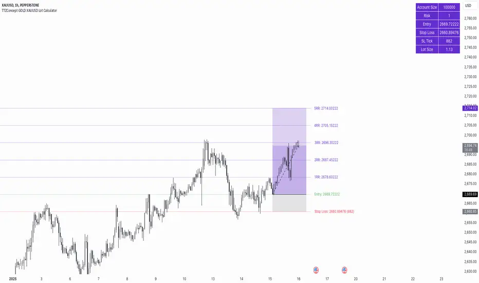 The Gold Lot Size Calculator for XAU/USD on TradingView is a powerful and user-friendly tool designed by TTZ Concept to help traders calculate the optimal lot size for their Gold trades based on their account size, risk tolerance, and the price movement of Gold (XAU/USD). Whether you're a beginner or an experienced trader, this tool simplifies position sizing, ensuring that your trades align with your risk management strategy.Key Features:
