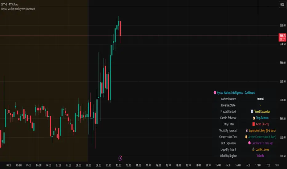 Nyx AI Market Intelligence Dashboard is a non-signal-based environmental analysis tool that provides real-time insight into short-term market behavior. It is designed to help traders understand the quality of current price action, volume dynamics, volatility conditions, and structural behavior. It informs the trader whether the current market environment is supportive or hostile to trading and whether any active signal (from other tools) should be trusted, filtered, or avoided altogether.