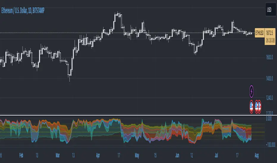 Williams %R technical analysis oscillator by Larry Williams with 8 customizable periods and fills. Default periods: 10, 13, 21, 34, 55, 89, 144, 233. Default colors: "One Half" color scheme by Son A. Pham.