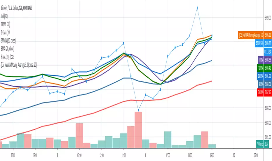 As shown in the picture Nwma is performing better than DEMA, TEMA, EMA, and other common used moving averages such as Hull MA that is prone to overshooting. With NWMA lag is extremely reduced.
