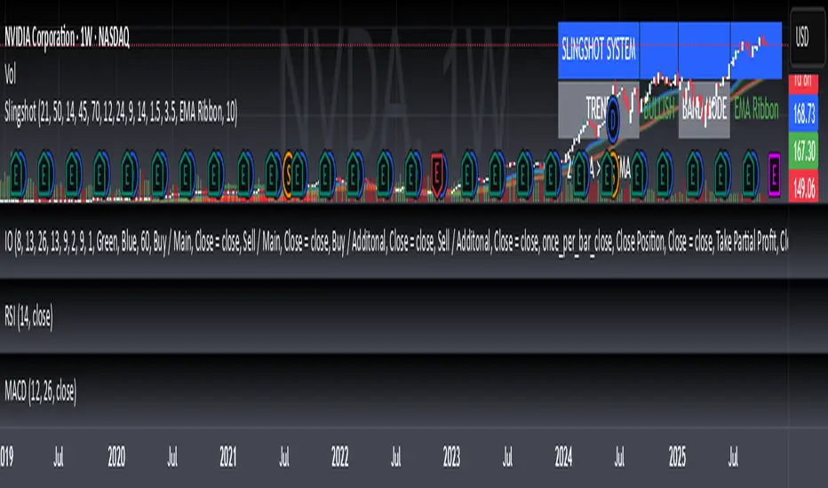 Slingshot Trading System is a comprehensive trend-following indicator that combines multiple technical analysis layers into one actionable dashboard. It identifies high-probability pullback entries in established trends using EMA alignment, RSI/MACD momentum confirmation, and ATR-based risk management.Key Features: