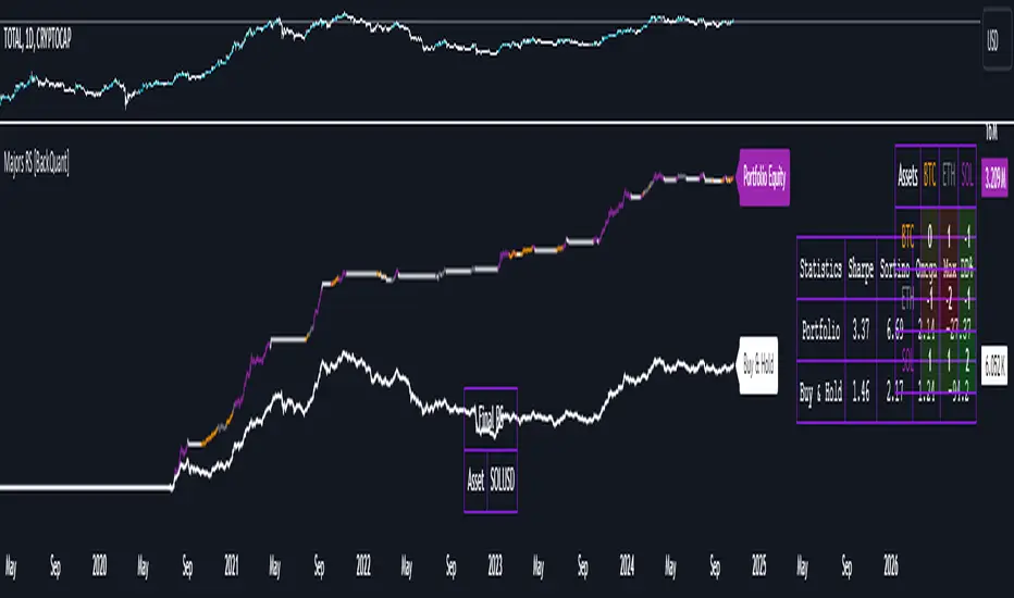 The Majors Rotation System [BackQuant] offers a powerful way to navigate the highly volatile crypto market by rotating between the strongest performing assets and staying in cash when conditions are unfavorable. With its advanced metrics, equity tracking, and built-in regime filter, this system is designed to optimize returns while minimizing risk.