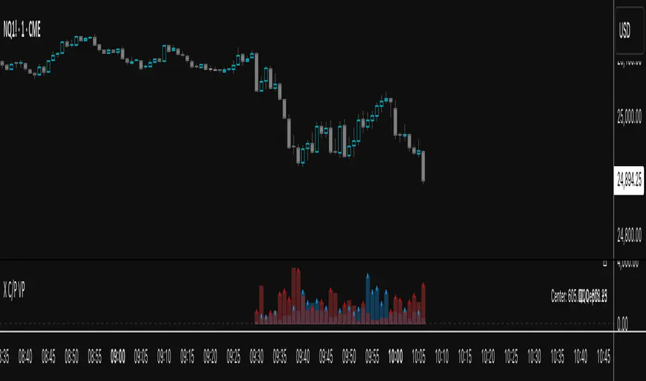The X C/P VP indicator visualizes intraperiod option flow dynamics for any selected call and put contracts. It plots the volume of both options as overlapping histograms, allowing traders to observe where liquidity and participation are concentrated.
