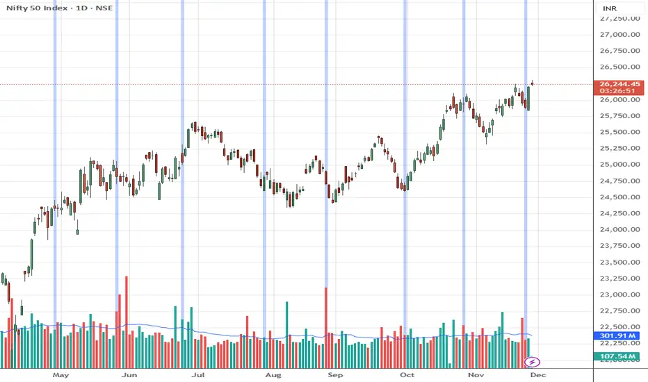 Automatically highlights weekly and monthly options expiry days for NIFTY, BANKNIFTY, and SENSEX using color-coded background shading. Works across entire chart history with customizable transparency levels.