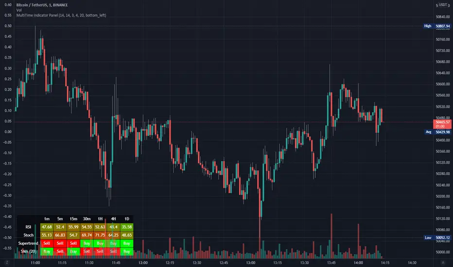 This indicator renders a table with 2 rows and 7 columns displaying the values of RSI and Stoch over different time periods. This works best on 1m charts due to a bug with the time periods I haven't yet solved.