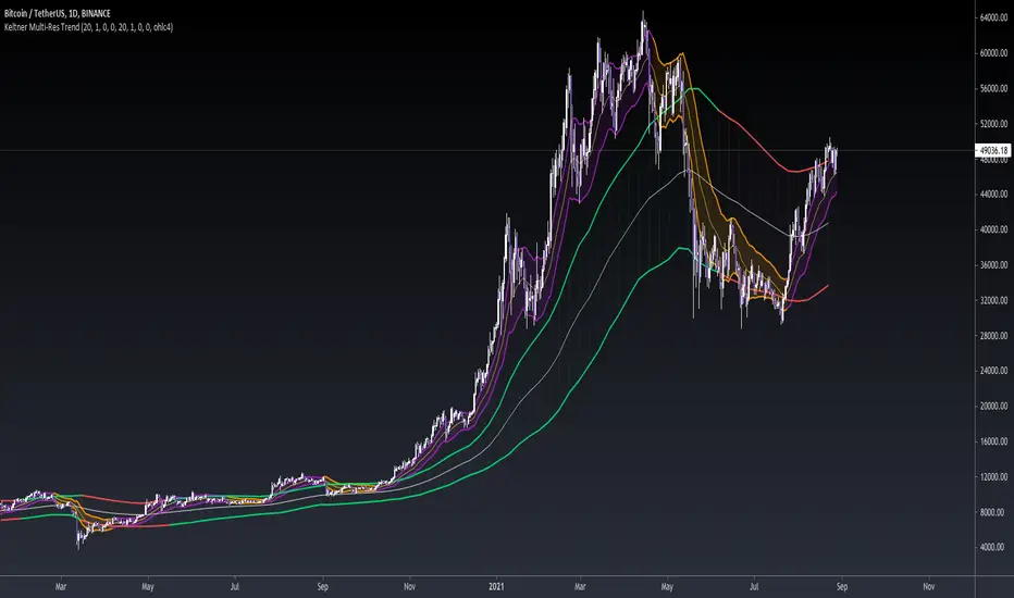 This is an extension of the Keltner Trend indicator by jaggedsoft. I have added a some features including an EMA / SMA option, horizontal and vertical offsets, and the addition of a second instance of the trendicator of a higher timeframe. If you want to change any timeframe, just open the code and update that section of the script. Thanks, and I hope you find it useful or interesting at least.