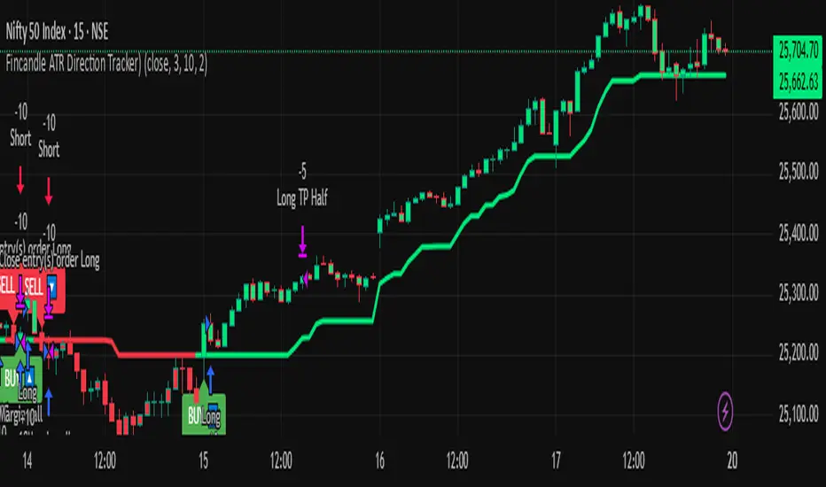 The Fincandle ATR Direction Tracker is a strategy designed to capture momentum moves in the market using a dynamic ATR-based trailing stop. It identifies strong momentum candles and filters signals using trend alignment with moving averages.