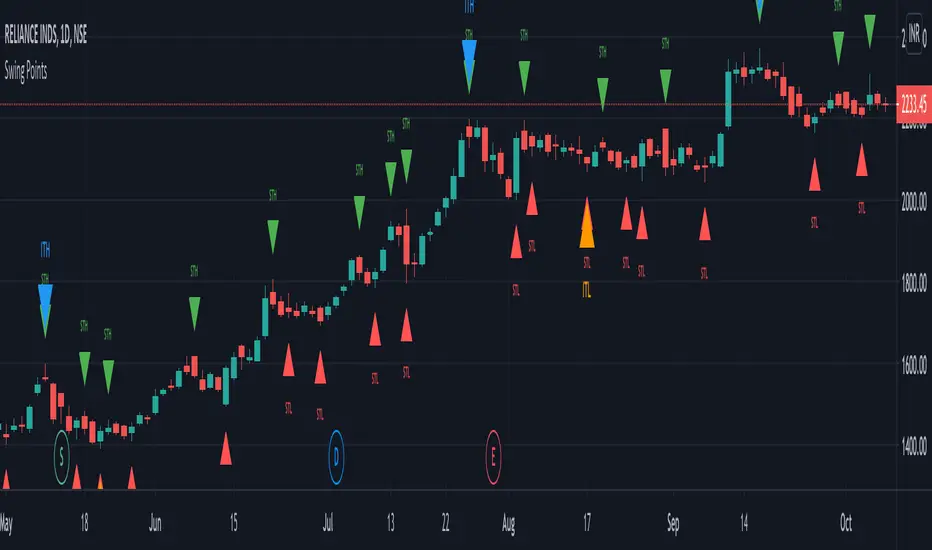 An indicator that identifies Swing Points (highs and lows) and then determines highs and lows of those swings. Works on all timeframes.