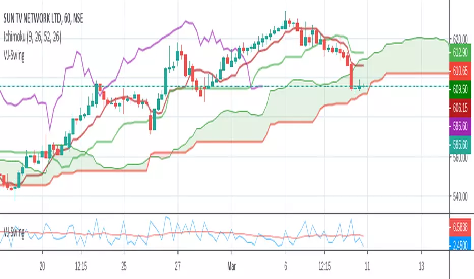 This indicator plots swing (high-low). It goes well with default Ichimoku cloud. It also has EMA over 26 periods. It can be used during scalping / intraday.