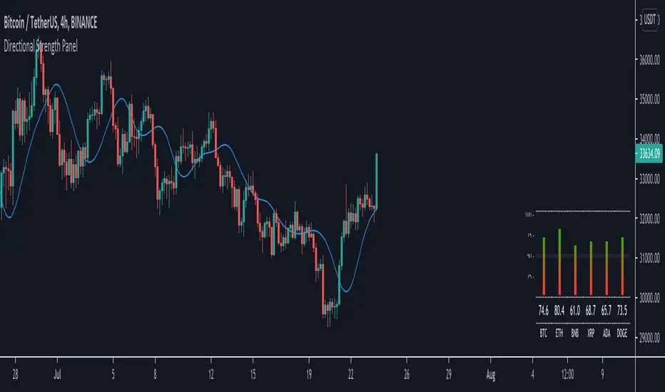 The panel display trend momentum of selected coins/symbol (up to 6) based on the Arnaud Legoux Moving Average (ALMA). I'm using ALMA to measure the trend because it resolves 2 main issue of the more common moving averages, smoothing and responsiveness. By removing the minor fluctuations in price without sacrificing the responsiveness, the trend become much more clearer and easier to be measured.